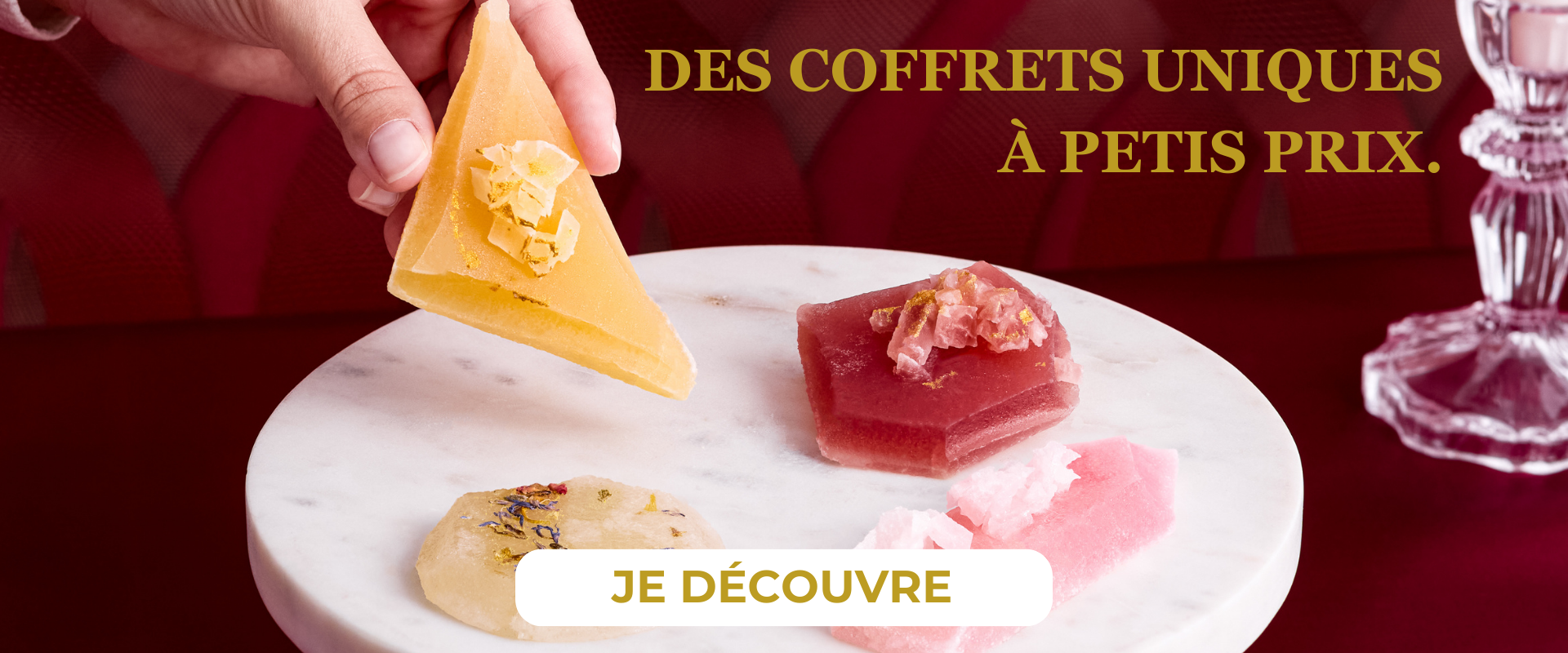 Fleur d’oranger, Tonka, Framboise, Thé Pêche, Rose… Laissez-vous séduire par nos coffrets élégants aux parfums emblématiques, ou composez le vôtre sur-mesure selon vos envies.