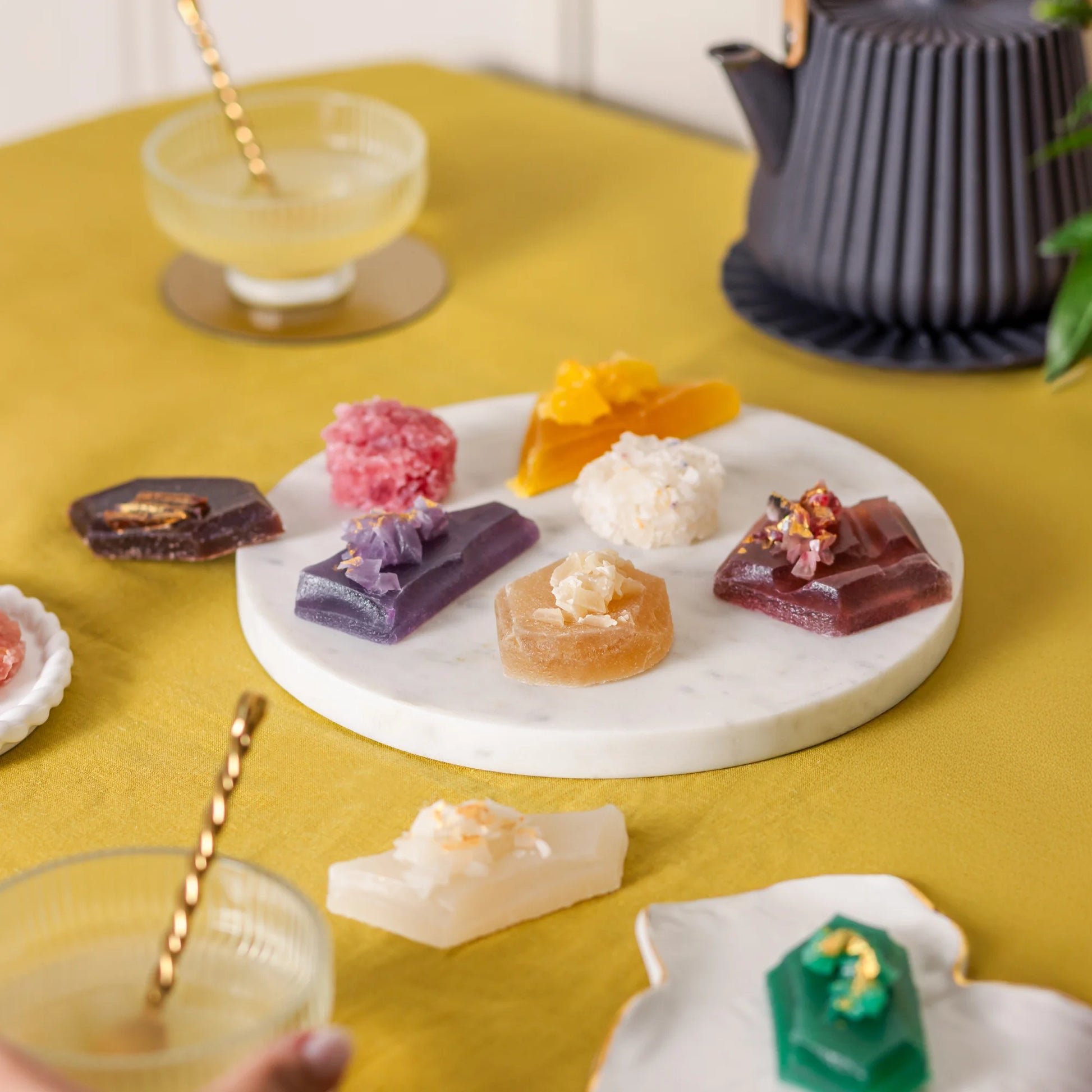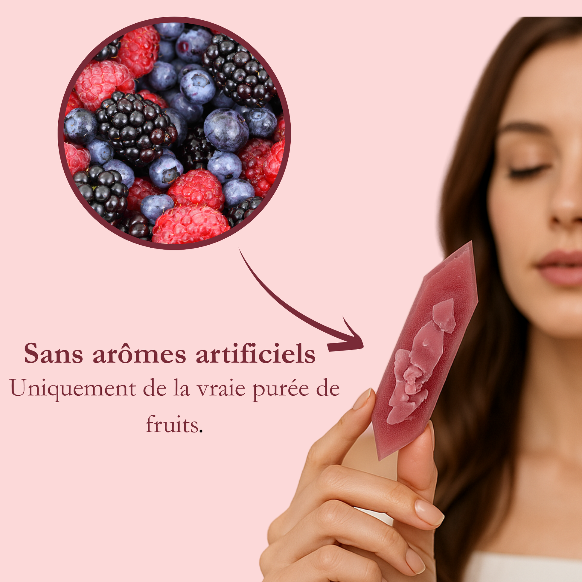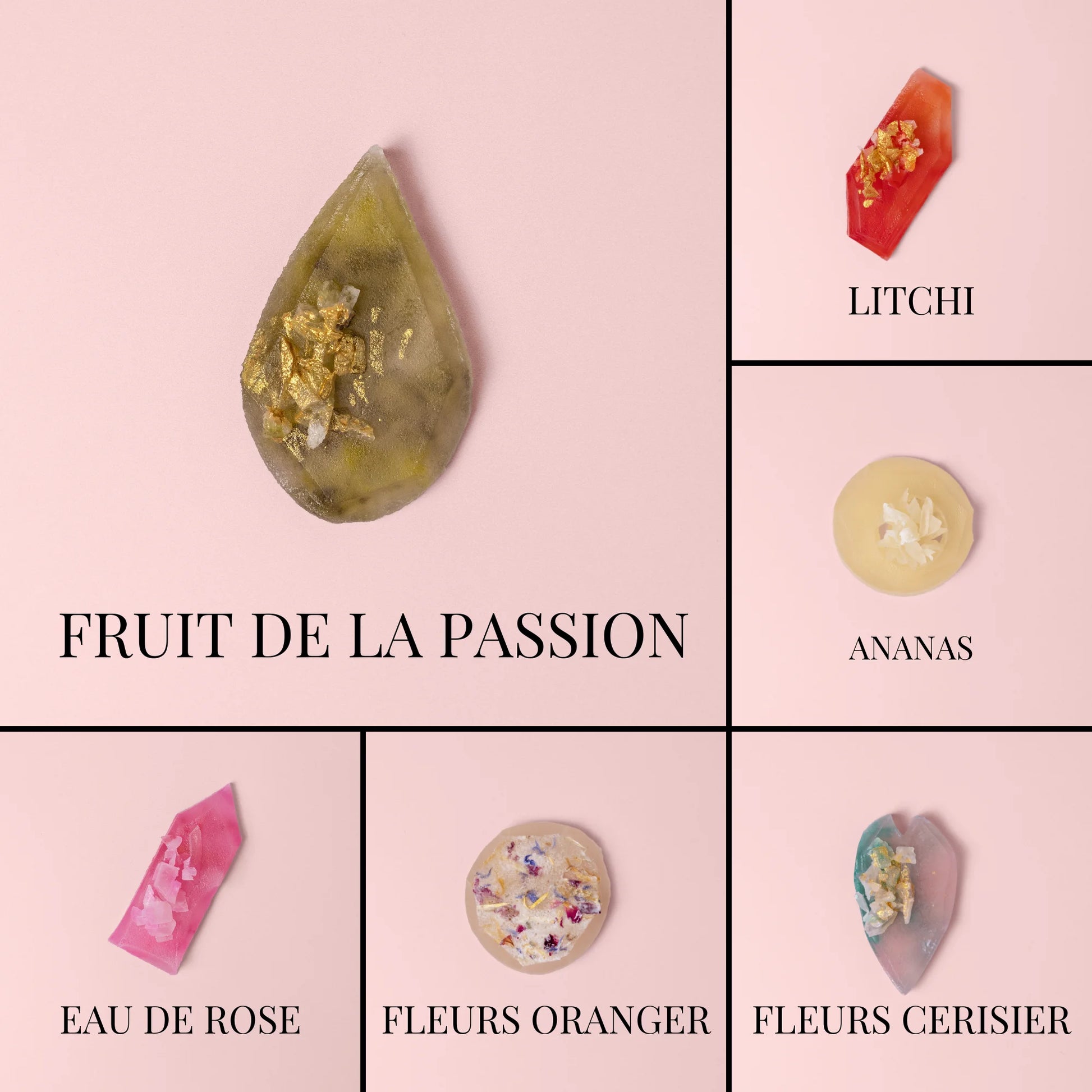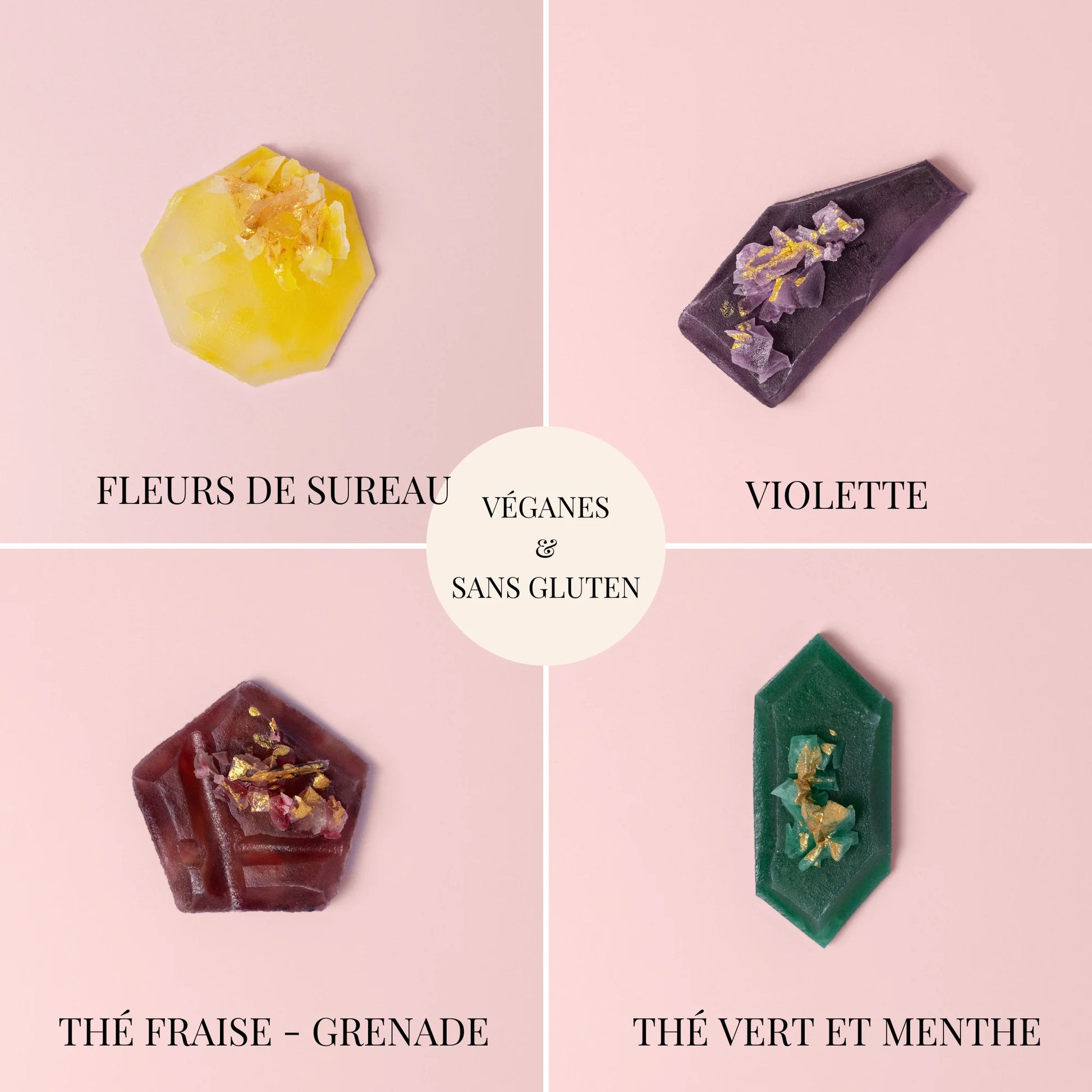 Choose your perfume of the day: soothing green tea, bewitching orange blossom or tangy raspberry. Slowly bite the crystal, let it melt on your tongue. Natural aromas reveal their intensity, like a jewel that reveals its light in the sun.