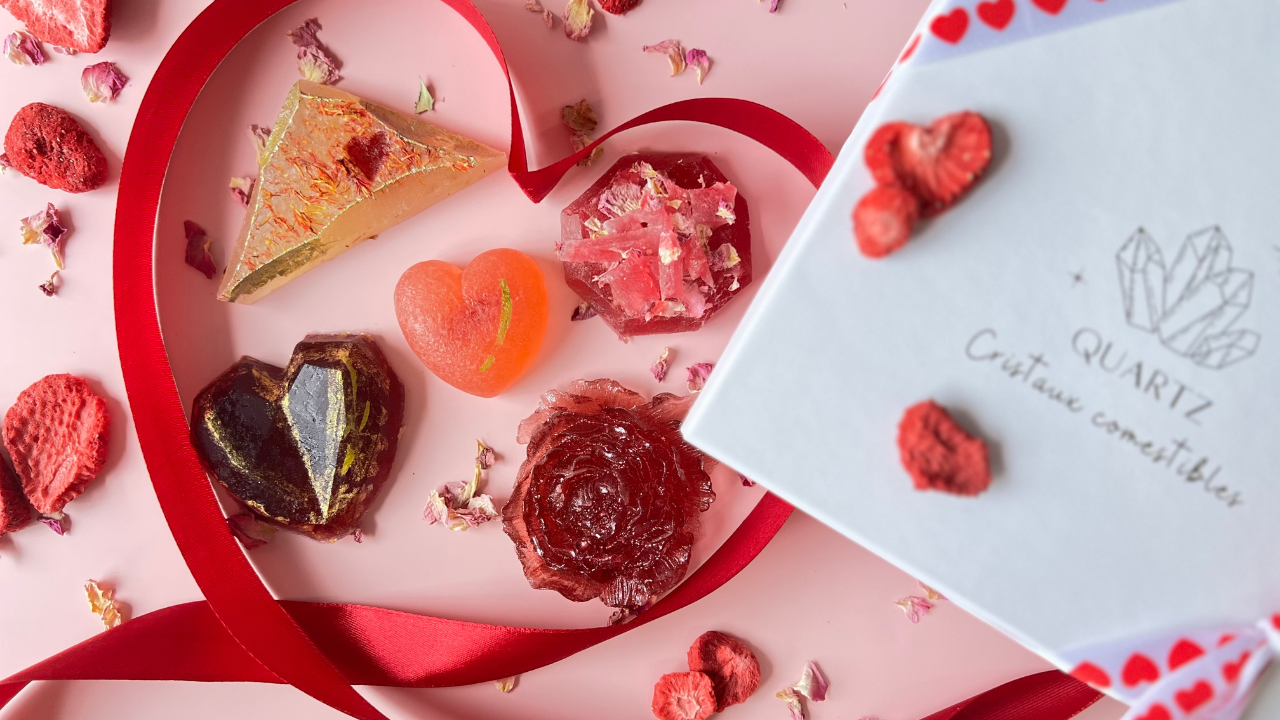 Nos cristaux comestibles sont fabriqués à partir de purées de fruits, d'infusions de thé ou de sirop à base d’arômes naturels selon les parfums, de sucre, et d’algues marines. Ces dernières, possédant des propriétés gélifiantes, nous permettent de les façonner à la main.