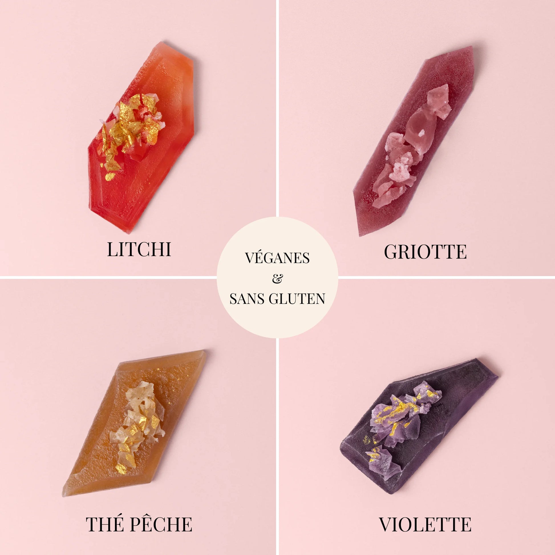 Un coffret élégant réunissant quatre cristaux aux saveurs fruitées et florales pour une dégustation précieuse.